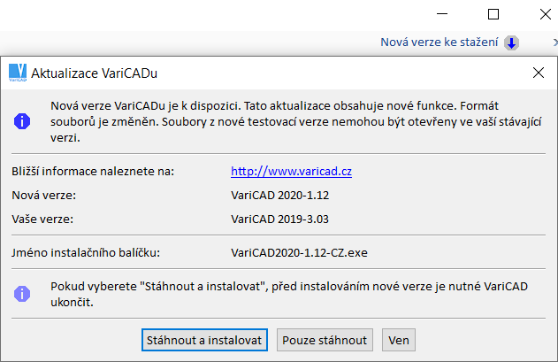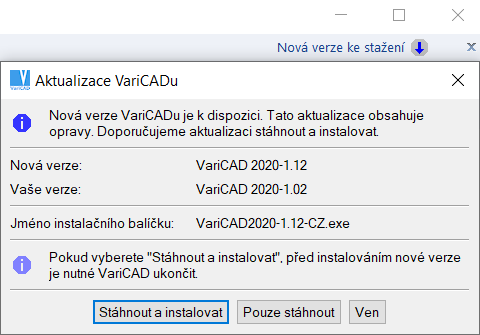Při spuštění VariCADu probíhá kontrola, zda je k dispozici nová verze VariCADu. Výsledek je zobrazen v pravém horním rohu okna VariCADu. Kliknutím na informaci o nové verzi ji nainstalujete.