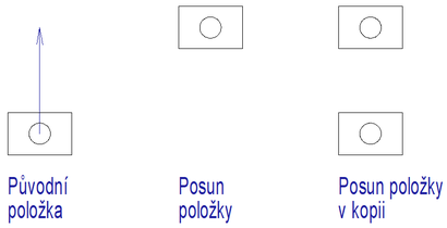 Vybrané položky posune (zkopíruje) ve směru a délce zadané vektorem. Vícenásobné kopírování vytváří řadu kopírovaných položek. Je možné zadat délku posunu, takže vektor určuje pouze směr.