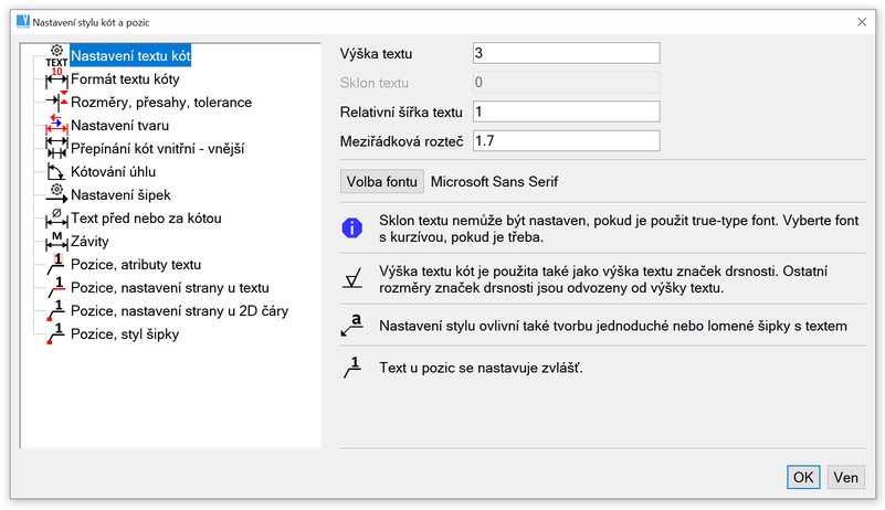 Změna nastavení kótování podle různých standardů kreslení, jako DIN nebo ANSI. Nastavení je společné i pro kóty drsnosti a šipky s textem.