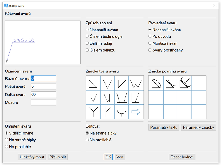 Dialogový panel kótování svarů