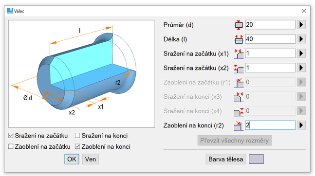 Odpovídající obrázky zobrazené v panelech se mění podle aktuálně nastavených možností. Možnosti válce například umožňují vybrat zkosení nebo zaoblení. Při změně těchto možností se obrázky zobrazují s nebo bez zkosení atd.