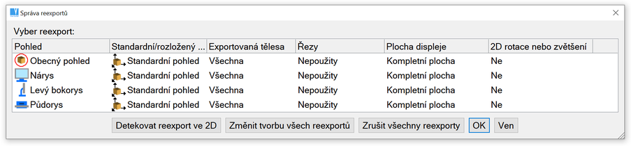 Seznam reexportů se může následně použít kdykoliv dojde ke změně 3D. Každý uložený reexport obsahuje: