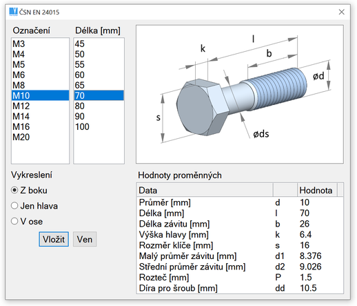 - Velikost obrázku ve výběrovém panelu (výběr typu šroubu, typu ložiska…)