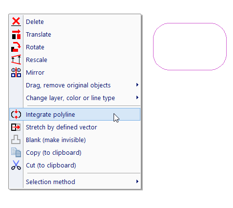 É possível selecionar objetos existentes e integrá-los numa polilinha. Se for selecionado um conjunto de objetos e terminar com um clique do botão direito do rato. Se todos os objetos selecionados podem ser integrados numa polilinha, a opção é mostrada no menu de pop-up.