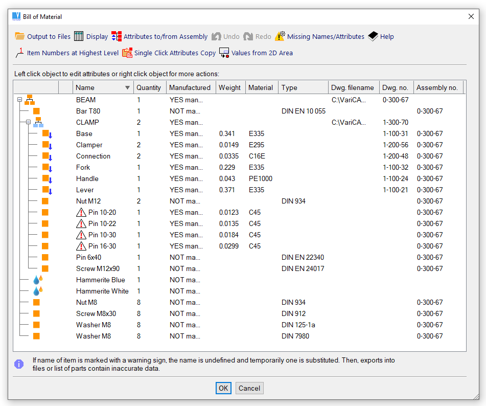 Para definir a numeração de itens na Lista de Materiais, a máscara da sua Lista de Materiais deve conter atributos do tipo “Numeração de Itens”. Podemos então atribuir a numeração de itens a objetos da montagem, ao mais alto nível. Depois da criação do 2D, a numeração de itens é automaticamente usada como textos guia.