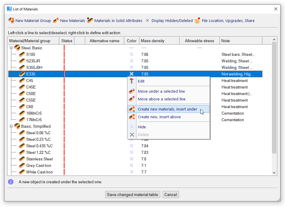 Para criar um novo material, faça clique com o botão direito do rato numa linha e selecione se o novo material é inserido acima ou abaixo desta. Pode também clicar um ícone correspondente na linha superior de ícones. Para criar um novo grupo de materiais, para editar ou eliminar um material ou um grupo, clique numa linha e selecione um passo a partir do menu que surge.