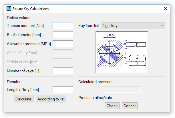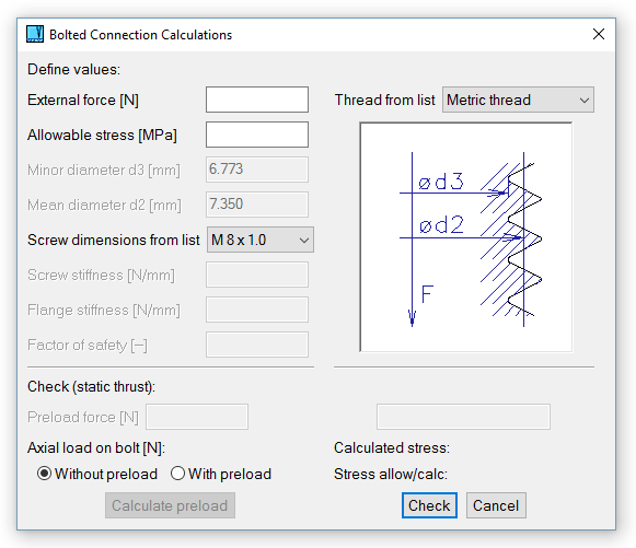 Os cálculos mecânicos podem ser acedidos a partir de Objetos / Cálculos. Para as unidades só são usadas as normas ISO (mm, N, MPa etc.). Podem ser calculados os seguintes tipos de valores: