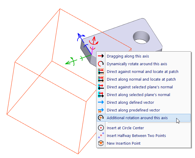 Outra vantagem da rotação adicional ao redor dos eixos combinados com as definições dos constrangimentos, é uma possibilidade o constranger objetos em qualquer direção, independentemente do estado inicial dos seus eixos. Os objetos são sempre constrangidos na direção dos eixos X, Y ou Z. Os eixos são direcionados de acordo com o modo como o sólido foi criado e a direção pode nem sempre ser conveniente. Depois da transformação dos objetos e da rotação adicional ao redor de um eixo, é possível constranger os objetos exatamente com a direção desejada.