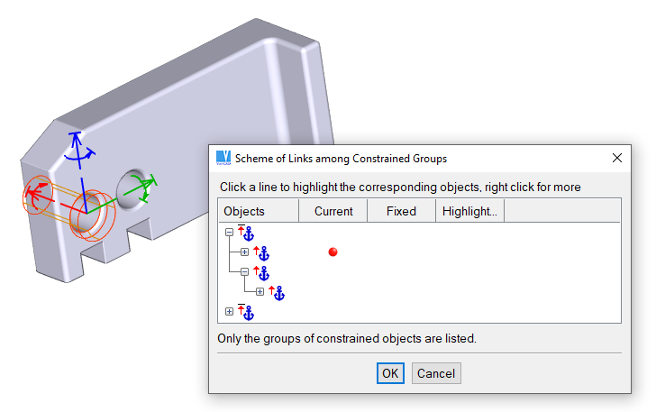 Os objetos constrangidos, são visualizados no esquema. Este permite visualizar facilmente todas as dependências – pode ver toda a cadeia de constrangimentos. Antes da seleção, opcionalmente pode realçar um grupo constrangido – então pode ver exatamente qual o objeto ou objetos que vão ser selecionados. Pode também opcionalmente, clicar num objeto, no espaço 3D e se constrangido, ambos realçados no esquema e no 3D.