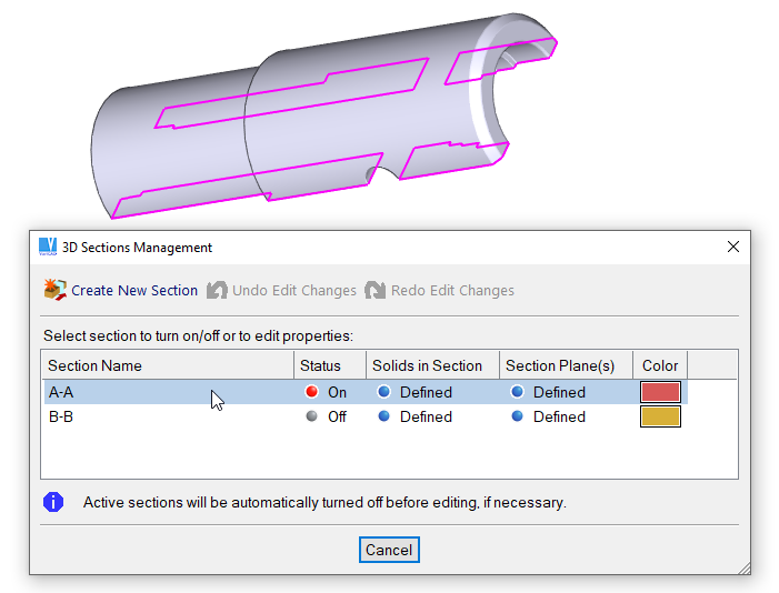 Esta função liga ou desliga as secções selecionadas. Permite também a definição de uma nova secção, definir os sólidos seccionados, planos de corte ou cancelar a definição da secção 3D.