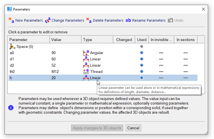 Os parâmetros podem ser usados sempre que um objeto 3D requer valores definidos. O valor pode ser uma constante numérica, um parâmetro simples ou uma expressão matemática que opcionalmente pode conter parâmetros. Os parâmetros podem definir as dimensões dos objetos ou um posicionamento dentro de um sólido, se usado em conjunto com os constrangimentos geométricos. A alteração dos valores dos parâmetros, faz com que todos os objetos 3D sejam reconstruídos. Os parâmetros não são suportados no ambiente 2D.
