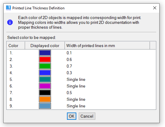 Quando usar uma impressora a cores, pode mapear as cores de visualização para a impressora a cores. Para impressora standard, é possível mapear as cores visualizadas, para as espessuras das linhas de impressão. O resultado é diferente, se as cores forem mapeadas antes. As espessuras das linhas e o mapeamento das cores, pode ser feito dentro da função Configurações de Impressão, ou no comando “CFG”, na secção 2D.