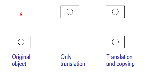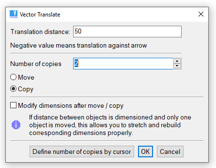 Moves or copies objects along a defined translation vector. The vector is defined by two points and indicates distance and direction. If objects are to be copied, you can specify the number of copies, and the original object is preserved. Multiple copies are made along a row. You can modify the length of translation, so the original vector defines only a direction.