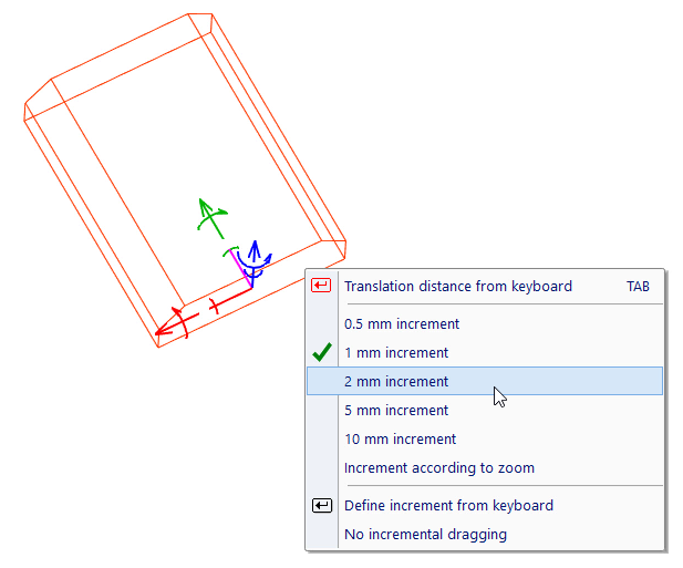 Example of solid dragging, after right-click. Pop-up menu offers increment options.