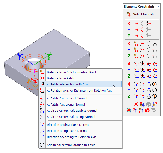 Selecting constraint definition from pop-up, for a detected element (hole)