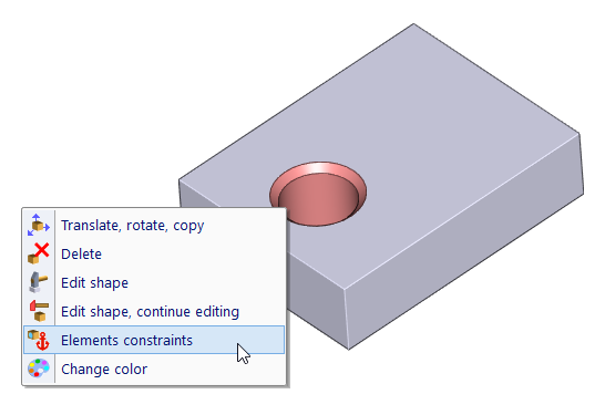 To create, change or delete constraints, you can right-click an object and select the command from pop-up menu. In case of constraints of a solid element, press and hold Ctrl and move cursor over objects. Then, single elements are detected and menu called by right-click is related to detected element.