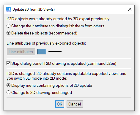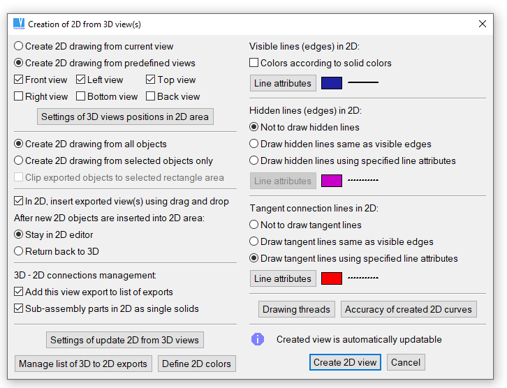 Management of method of 2D drawing updates and management of individual 3D views exported into 2D is available from dialog panel Exporting Views and Sections from 3D to 2D - see description of command above.