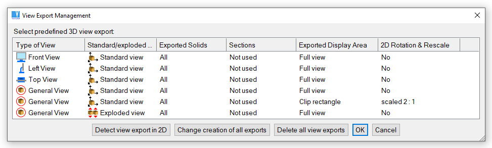 Manages a list of predefined view exports. This function is available also from Update 2D after 3D Changes or from Creating 2D from 3D. The view export can be selected from the list as well as from corresponding 2D objects. You can: