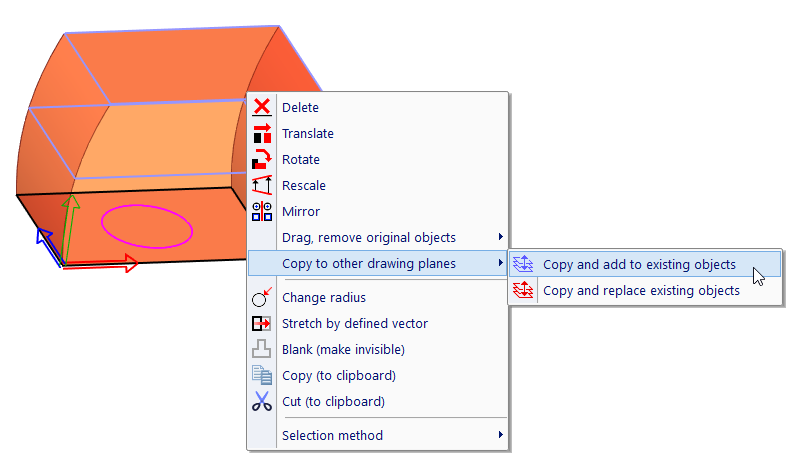 To copy 2D objects among the rest of sketching planes, select the objects. Then, right-click and from related sub-menu, select method of copying: