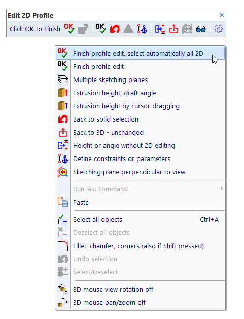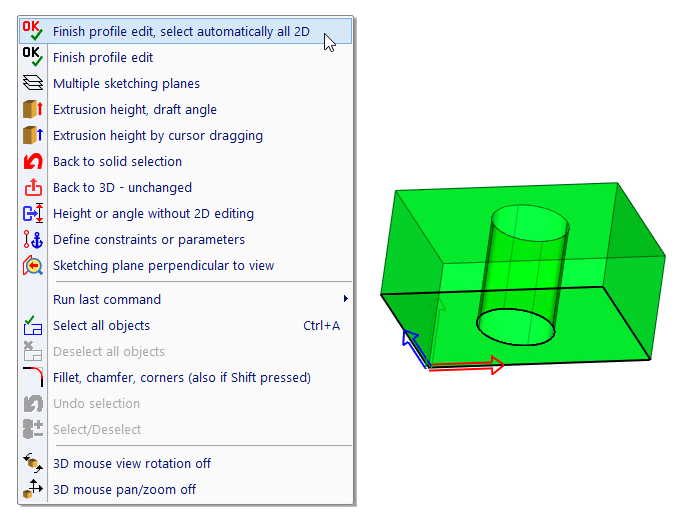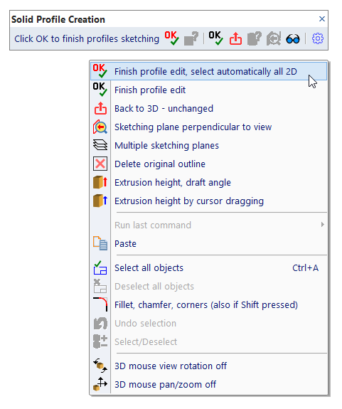 | Finish profile edit, select automatically all 2D objects. This command finishes edit. If you already defined values like extrusion height or rotation angle, entering of them is skipped. If you already transformed the base sketching plane or if a plane was selected as a planar surface of a solid, transformation of new solid is also skipped. |