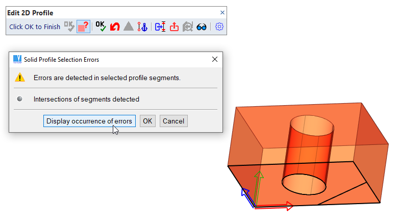 In case of erroneous profile, or whenever a solid cannot be rebuilt, you can click a corresponding icon and display what caused the problem. On the other side, if the profile is correct and the solid can be created, you can finish profile creation and skip selection of profile’s segments – all 2D objects are selected automatically.