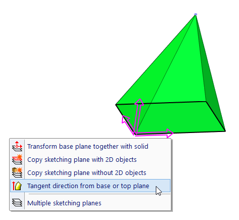 If you start creation of a solid defined by profiles extrusion, rotation or lofting, a pop-up menu appears and you can select sketching plane. If you select an existing solid for editing, the sketching plane is defined automatically according to solid location.