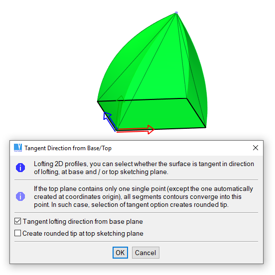 Tangent direction can be selected for lofting from base plane or top plane. This causes the patches edges at base or top plane have normals perpendicular to plane normal. Tangent direction can be selected independently for both base and top plane.
