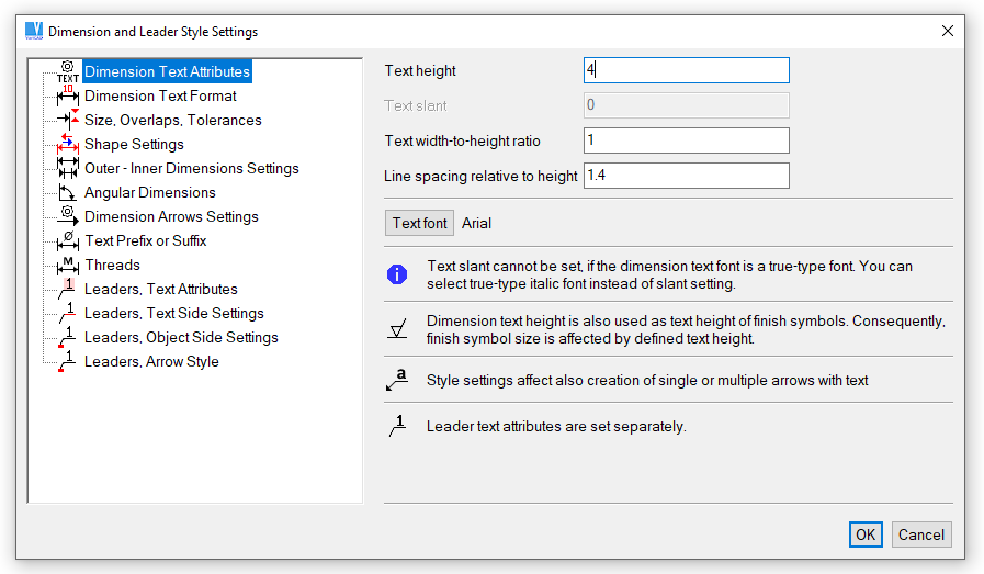 Once created, the dimensions can be easily edited (see Editing Dimensions ). Format and style of dimensions and dimension text can be modified using Dimension Attributes. Changing dimension text height affects the length of leader lines arrows.