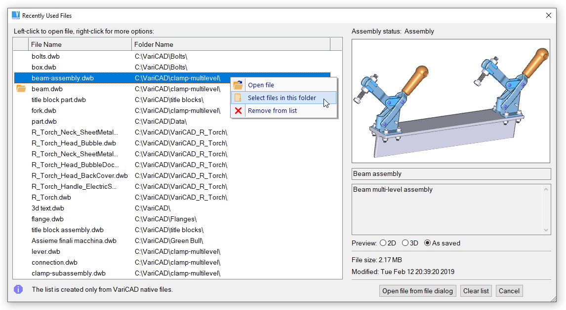 VariCAD files created in versions up to 2018 do not contain preview images or titles and descriptions. Previews are displayed only as wire-framed 3D scene.