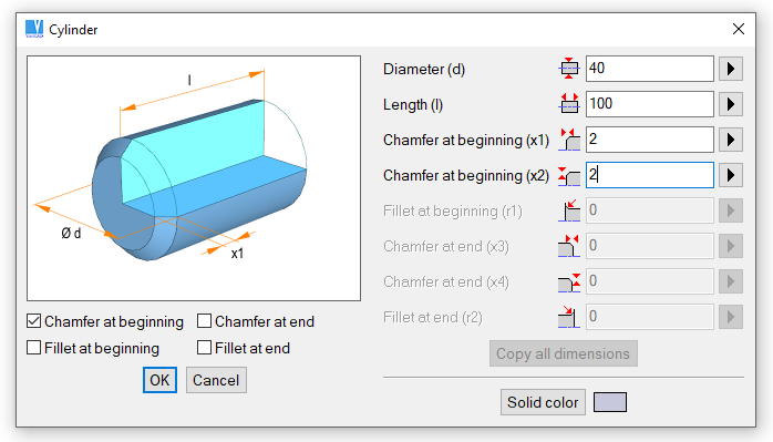 Basic solids are easy to create; you need to specify only basic dimensions. Editing involves changing the basic dimensions, or modifying any 2D profiles that are used. When entering solid dimensions, you have the option of copying any or all dimensions from another solid of the same type. Primarily, dimensions of solids are edited using spatial dimensioning. Optionally, you can select entering dimensions in panel. In panel, you can also change basic shape, like chamfering cylinders etc.